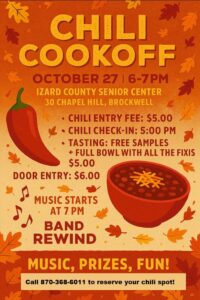 Join us for a spicy evening of fun, flavor, and friendly competition at the Izard County Senior Center in Brockwell on October 27 from 6–7 PM! 🍲